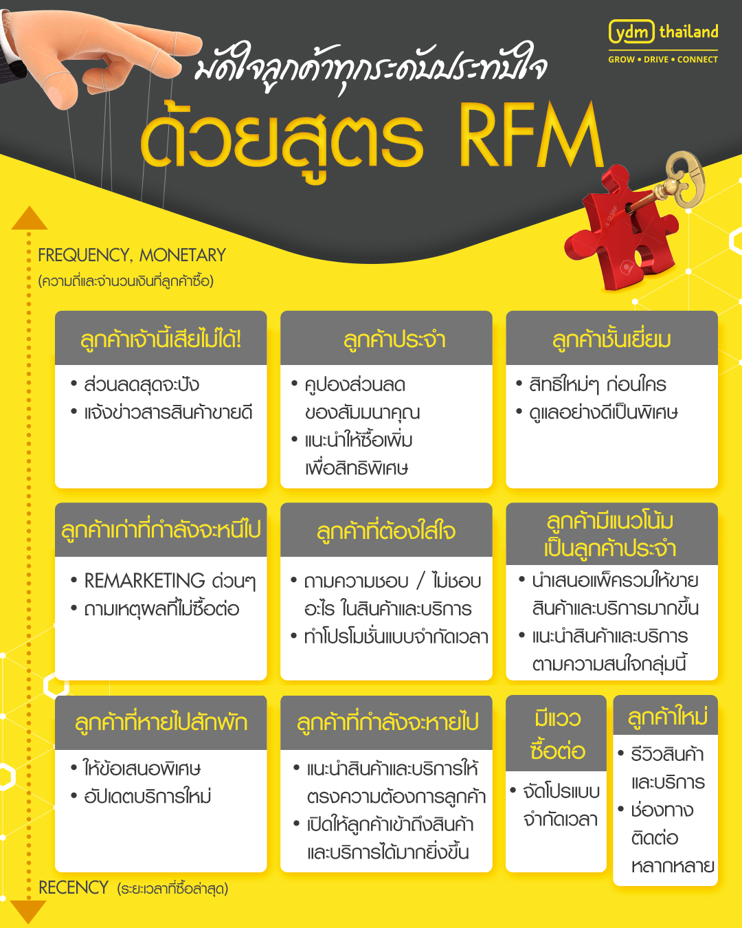 🤗 อยากรักษาลูกค้าในทุก Segment ต้องใช้สูตร RFM มัดใจครับ ซึ่งสูตรนี้สามารถใช้ได้ทั้งลูกค้าเก่าและลูกค้าใหม่ในสินค้าและบริการของคุณ
